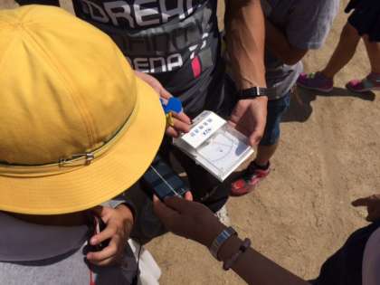 置く場所(陰と日なた)や光電地の角度を変えてみて、検流計の針のふれ方やモーターに取り付けられた羽根のまわり方などを比べてみました。