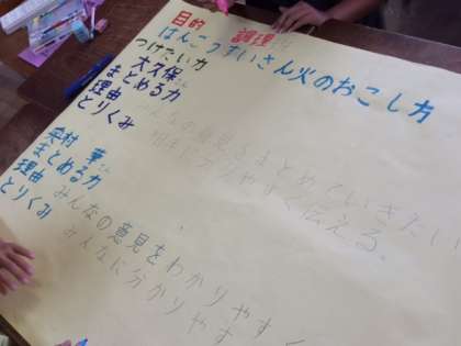 活動の目的や方法をそれぞれの班が紹介する中間発表に備えて、模造紙に発表内容をまとめています。