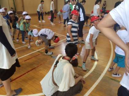 1・2年は講堂で「追い出し玉入れ・ボール送りリレー」を行いました。