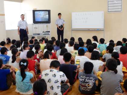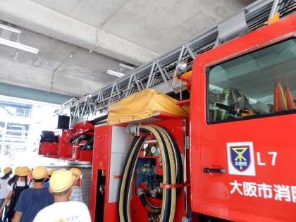 7月5日(火)夏の太陽が照りつける中、4年生は住之江消防署へ社会見学に行きました。消防署で働く人の役目や苦労について話を聞きました。