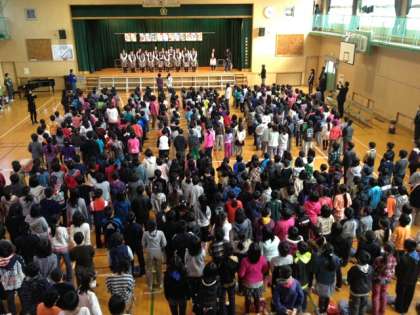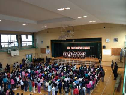 11月21日(木)台湾の花蓮縣(フアリアン)中正國(チュンツェン)小学校の5・6年生の児童と音楽交流会を行いました。台湾の小学生の素晴らしいリコーダー演奏に、安立小学校の児童も5年生がお礼の歌を歌い、最後は全学年で「花は咲く」を合唱しました。