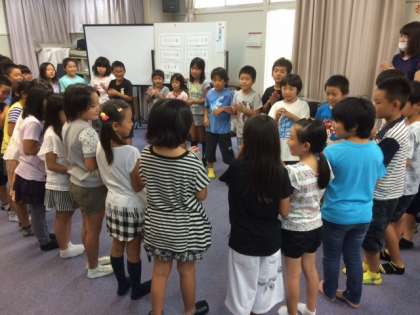 3年2組は、音楽のリズムにあわせて、手や体の一部をたたいて拍を感じ取る授業を行いました。