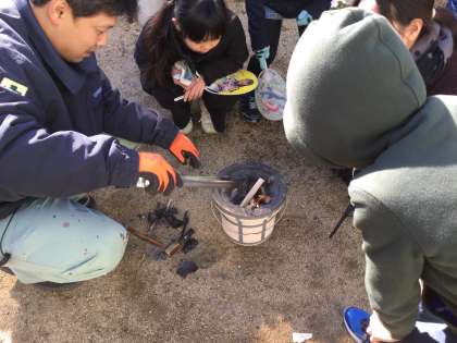 1月25日(水)、3年生は社会科の学習の一環で七輪体験をしました。3年の保護者Aのボランティアにもお手伝いいただき、炭の火起こしから火力の調節、丸もちを焼くところまで行いました。