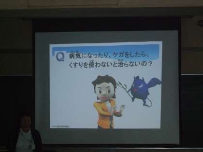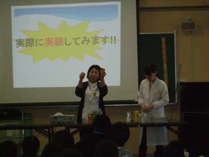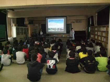 1月16日(木)今日は6年生の児童が安立ホールで薬の正しい使い方について学習しました。スクリーンに映し出される薬に関する正しい知識をしっかりと学び、目の前で行われた薬を使った実験に興味津々で見入っていました。