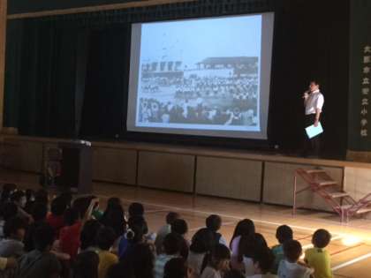 校長先生が、学校にある記念誌などを調べて、むかしの安立小学校の写真を映し出したものを見せながら話をしました。