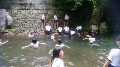 川遊びを楽しんでいます。 水の冷たさに歓声が上がっています。 自然って素晴らしい!