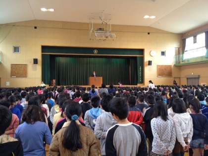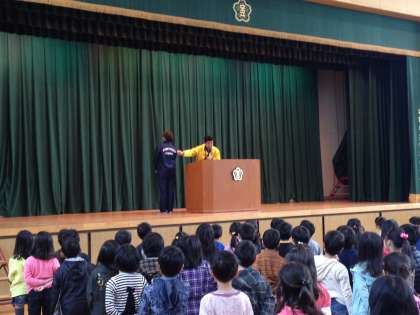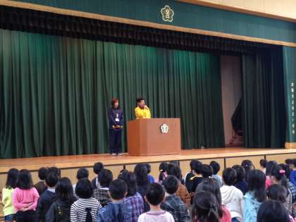 4月21日(月)今日の全校朝会で、住之江区役所よりセーフティーパトロールの方が来られました。地域の防犯についてのお話や、子ども110番の家についての説明をしていただきました。