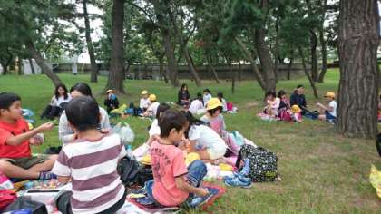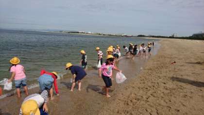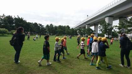 2年生の秋の遠足は、電車を乗り継いで、二色浜公園へ。天候にも恵まれ、砂浜で水遊びや貝がら拾いをした後、虫探しや鬼ごっこ。おいしいお弁当を食べた後も遊具で遊び、大はしゃぎでした。