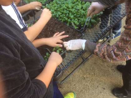 今日は、地域の方々が種を巻いて発芽した苗をさらに大きく育てるために、一つ一つポットに株分けしました。葉を傷めないように移植用の金ばさみで根っこの部分をそっと分けるようにするといことを地域の方や住之江区役所の方に教えてもらいました。