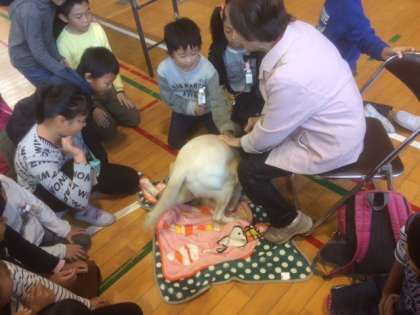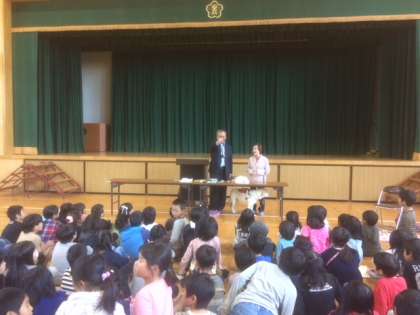 3年生は、視覚支援の必要な方である山本さんともうどう犬のフェリシア号をゲストティチャーとして迎えて、もうどう犬のお話を聞きました。