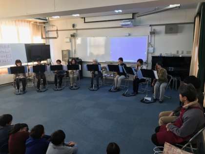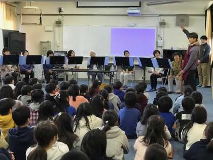 11月21日(火)、安立商店街にある竹山木管楽器製作所の皆様にお越しいただき、木製リコーダーの作り方や素材、素材による音色の違いなどを学びました。普段学習で使用しているソプラノリコーダー以外にも様々な大きさのリコーダーがあることを知り、驚きの声がもれていました。「マーム」の皆様によるリコーダー合奏は、とても温かい優しいハーモニーで、子どもたちは真剣な表情で聴き入っていました。とても贅沢な時間となりました。