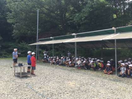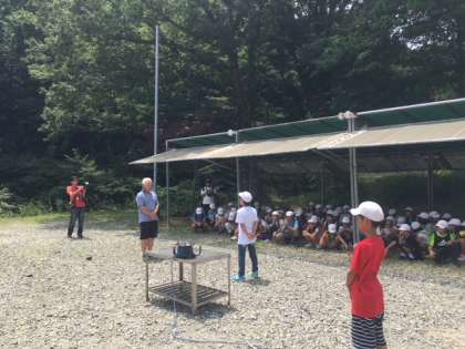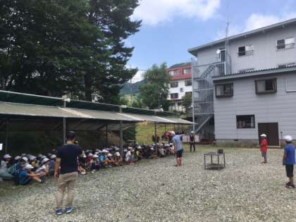 宿舎前の広場で、開校式を行いました。児童代表のあいさつとともに、みんなで「よろしくお願いします」の気持ちを伝えました。宿舎の方からは、ハチ高原についての説明をしていただきました。部屋割りに続き避難訓練をし、いよいよ、ハチ高原での自然体験学校が、本格的にスタートです。