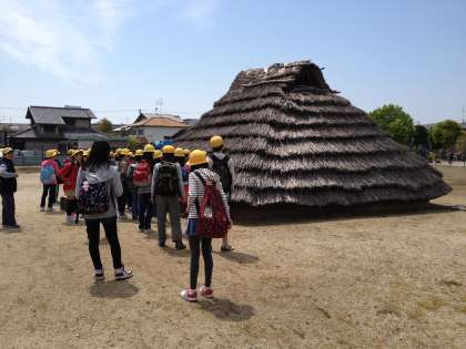 4月25日(木)6年生は弥生文化博物館・池上曽根遺跡に春の遠足に出かけました。天候にも恵まれ、青空のもと竪穴式住居作りを体験したり、弥生時代の人々の文化や生活をいろいろと学んできました。