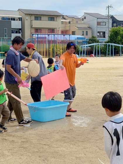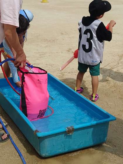 チームに分かれて、水鉄砲を使い、相手陣地に水を多くかけた方が勝ちです。