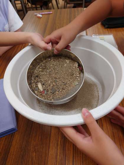 砂浜の砂をふるいにかけ、下に落ちたものを見てみます。