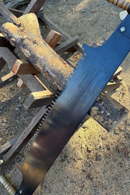 二人一組なってのこぎりで丸太を小さく切っていきます。