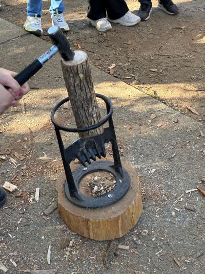 お昼ご飯のピザも自分たちで作ります。そのためには、まずは薪割り体験です。