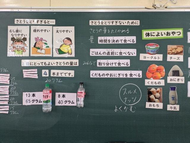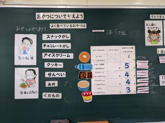 学習の導入にふだんどんなおやつを食べているかを聞いてから、色々なおやつに含まれる砂糖の量を予想しました。