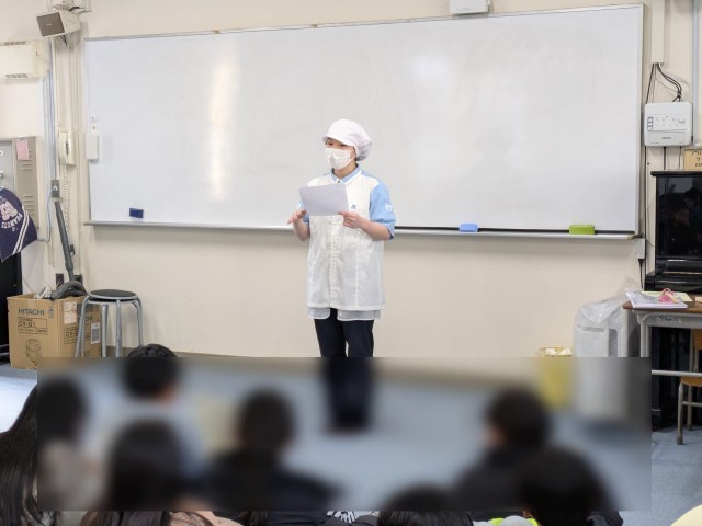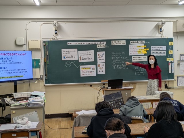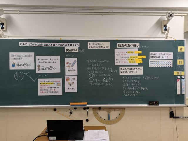 授業では、世界の食糧事情から食品ロスの原因や、出さないための工夫などについて考えました。