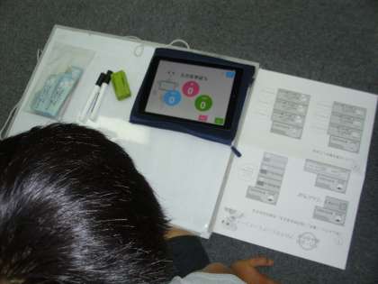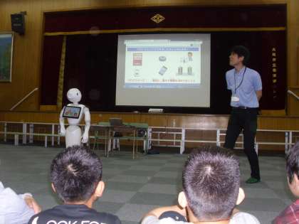 最初に、ペッパー君がプログラムの「入力」、「出力」について子どもたちに教えてくれました。次に、子どもたちはペッパー君を動かすプログラムを班で考え、タブレットを使って「入力」し、ペッパー君を実際に動かす活動をしました。