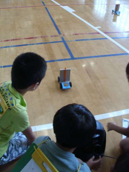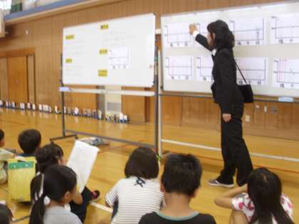 3年生は風の力でヨットカーがどれだけ進むかを実験しました。風の力が強くなればなるほど遠くまで進むことができることや、車の速さが風の力で変わることなどを班で協力して調べることができました。
