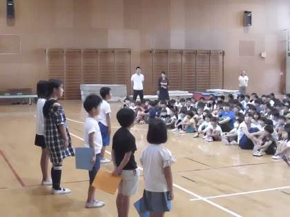 その後に各学年の代表の子どもたちが、1学期の印象に残ったことを発表しました。普段の学習の様子や頑張ってきたことを代表の子どもたちはみんなの前で堂々と発表することができました。また、聞いている子どもたちもしっかり発表者のほうをむいて聞くことができていました。発表が終わると大きな拍手がおこっていました。