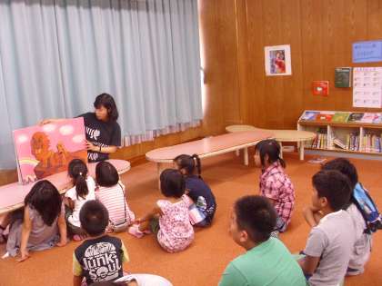 本年度は9時30分と10時30分の2回、先生の読み聞かせを実施しています。子どもたちはとても楽しそうに先生のお話を聞いていました。