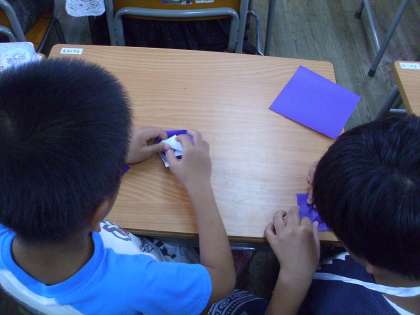1・2・4・6年生は平和への願いを込めて千羽鶴を異学年グループで折りました。
