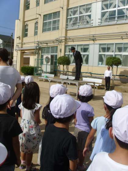 朝の児童朝会で校長先生から紹介がありました。約4週間敷津浦の子どもたちと一緒に活動をする予定です。