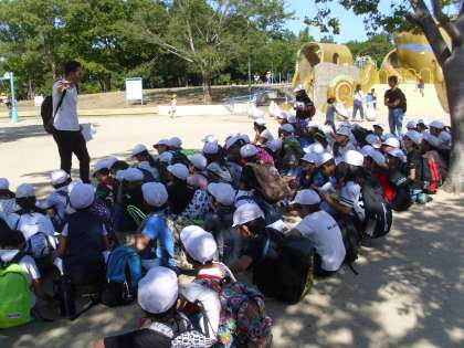 公園に着いてから、グループで『えんそくクイズ』というオリエンテーリングを行いました。公園にまつわるクイズをグループで協力して解きながら、目的地まで子どもたちは移動しました。子どもたちは地図を見ながら、迷うことなくゴールまでたどり着くことができていました。