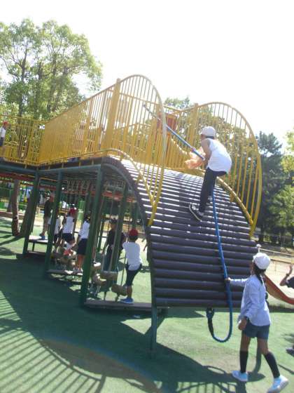 お弁当を食べてからは、公園の遊具で遊んだり、昆虫探しをしたりと、子どもたちも先生たちも汗だくになって遊びました。
