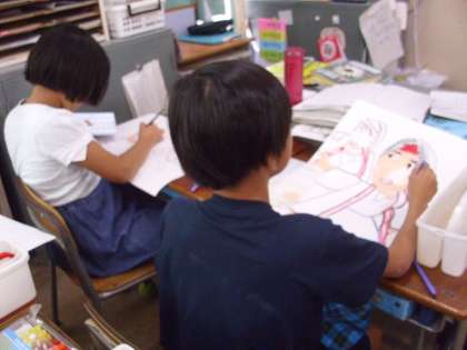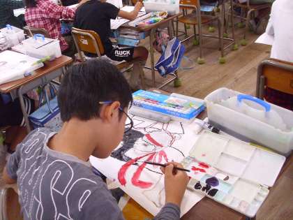 4年生は『ソーラン節』を踊っている姿を図画工作科の時間に描いています。力いっぱい腕を伸ばしている姿や、腰をグッと落としてしっかりふんばっている姿などを、躍動感いっぱいに描いていました。