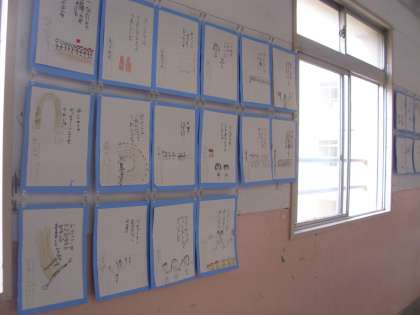 3年生は運動会で印象に残ったことを5・7・5の川柳にして書き、絵も添えて廊下に掲示しています。擬音語を使ったり、リズムに気をつけたりして作っていて、子どもたちの工夫が随所にみられる作品ばかりです。