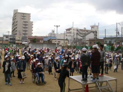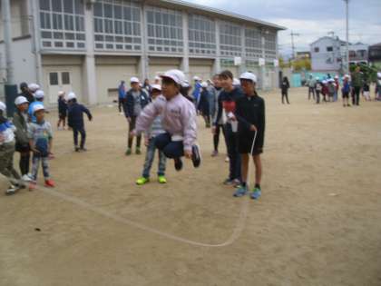 高学年の児童が、跳ぶ子どもたちが跳びやすいように縄の回すスピードを工夫したり、跳ぶタイミングの時に優しく声をかけていたりしていました。