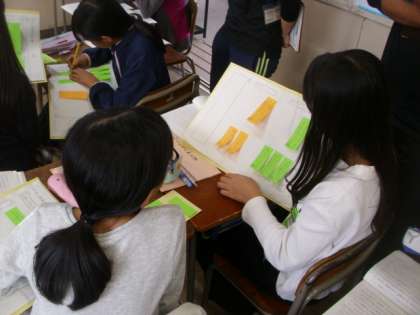 接続詞などを効果的に使って文章をまとめて要約し、それらをペアで交流したり、全体で交流をしたりして学習を深めていました。