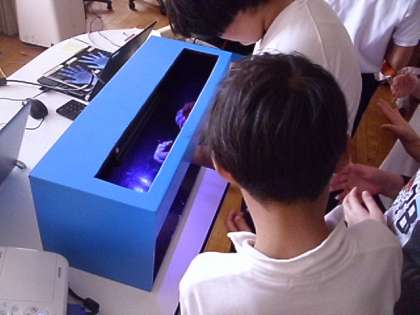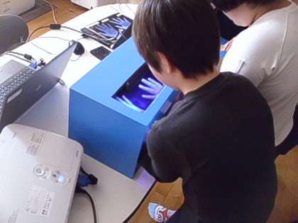 その後実際にどれだけきれいに手を洗うことができているかを手洗いチェッカーをつかって子どもたち各自で確認しました。しっかりと石鹸で洗っていても、爪の周りや指の間が十分に洗うことができていないことがわかりました。