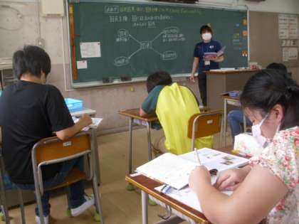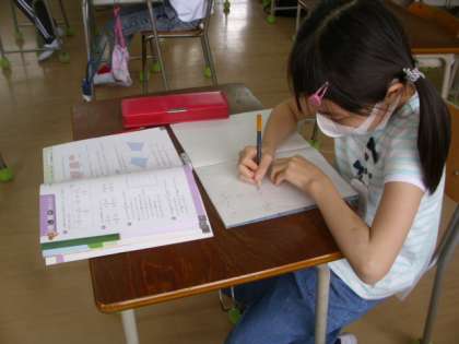 算数では分数の計算に取り組んでいました。分母と分子の関係に気をつけながら、一問ずつ丁寧に子どもたちは計算をしていました。