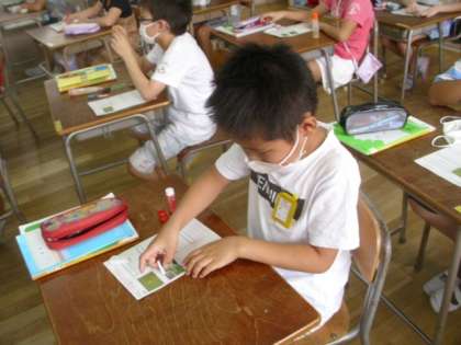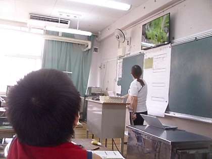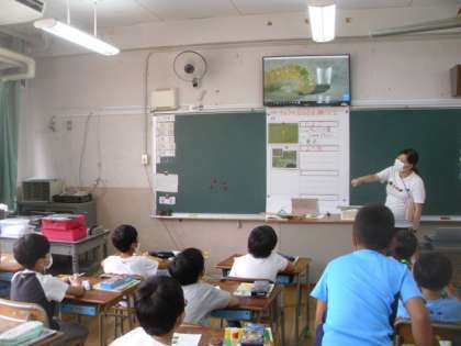 今日は、子どもたちにとって身近な「モンシロチョウ」と「アゲハチョウ」の成長について学習しました。卵から成虫になるまでを映像や、先生が学校休業中に撮った写真などを見て、子どもたちはワークシートにまとめました。