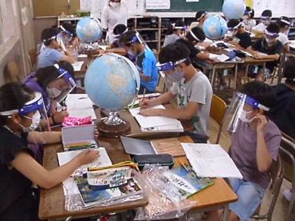 いろいろな国が、地球のどの位置にあるのかを、班で分かれて探しました。「形がいつも見ているのと違う」「大きさも違うんちゃう」など、子どもたちは様々な意見交流をしたり、新しい発見をしている様子でした。