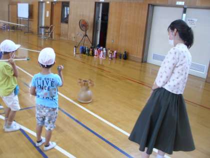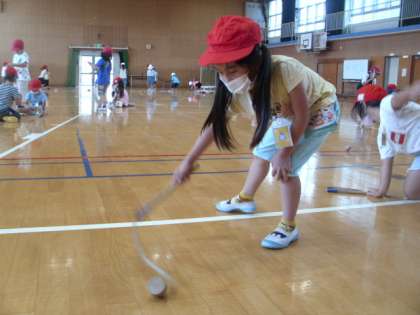体育館でトゥホ・ペンイ・チェギという遊びをそれぞれ班にわかれ、活動しました。ペンイで遊んでいる子どもたちは、「日本のコマみたいやけど難しいなあ」「こうやったら回りやすいで」と言いあいながら、工夫をして活動する様子が見られました。