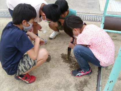普段、土や砂を比較して見たことがなかったので、「色が全然違う」「粒の大きさもそれぞれ違う」など、子どもたちはたくさんの新しい発見をすることができたようです。