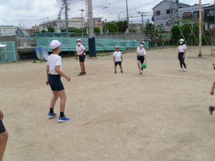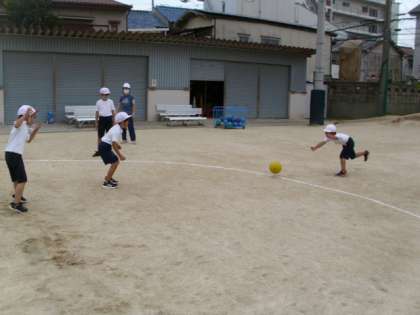 1年生の子どもたちは、6年生の投げるボールに当たらないようにコート内を楽しそうに走っていました。