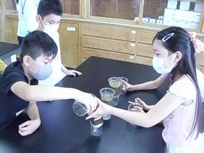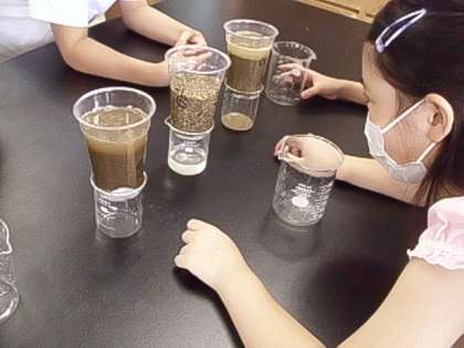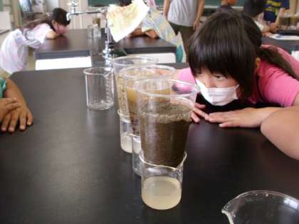事前に準備をしていた【土】【砂】【砂利】に水を吸い込ませ、浸み込んだようすを観察し、班で話し合いました。「こんなに浸み込む時間が違うなんてびっくりした」「浸み込んだ後の水の色もそれぞれちゃうねんな」といいながら、児童は実験結果をしっかりノートに書き写していました。