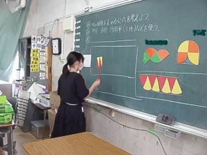 最後に16等分した円を同じようにきれいに並べていくと、「長方形や平行四辺形の公式で面積が求まりそう」と考えをまとめることができました。