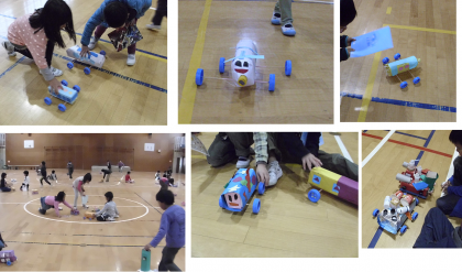 1年生は図工で「ゆめのくるま」を作りました。今日はその完成した車を体育館で走らせました。自分で作ったオリジナルの車を思い思いに走らせて楽しんでいました。