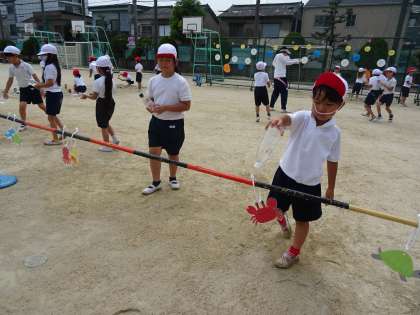 ペットボトルに水を入れていろいろな的に命中させ、子ども達はとても楽しみながら活動していました。