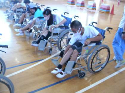 大阪市立心身しょうがい者リハビリテーションセンター職員の方々に、車いすの各部分の名前や使い方を教えていただいた後、子どもたちは順番に車いすに乗り、階段やスロープを上り下りする体験をしました。