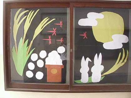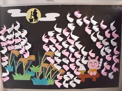 玄関の作品は、新聞・掲示委員会の児童が委員会活動で力を合わせて作成したものです。また、2年生の作品は、子どもたちが頑張って折り紙で作りました。ウサギがとてもかわいいですね。