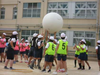 写真は6年生の『大玉ころがし・送り』のようすです。