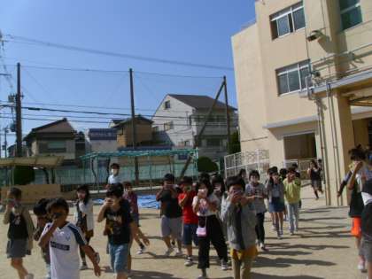 今回は給食室から出火したと想定した火災の避難訓練でした。子どもたちはマスクの上からハンカチやタオルで鼻と口を押さえ、しゃべらずに素早く非難していました。